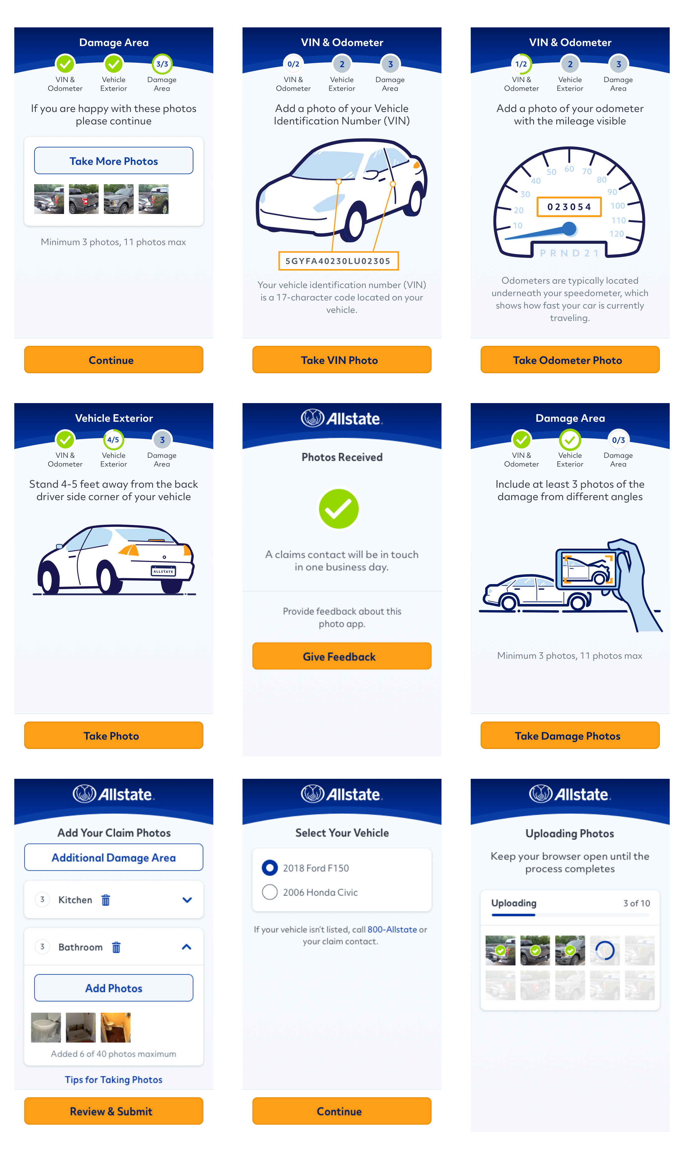 Above are some of the final results, using Allstate brand guidelines. I was able to remove 10 screens from the original guided flow. One of the better improvements was deep linking the user into the process with a link provided in the Allstate native app or in an email/text which eliminated several steps; entering vehicle information and the claim number. The developers were also able to increase the quality of saved photos making it downstream to the claims adjusters to help increase estimate accuracy. I also reduced element clutter and gave screens elements consistent placement, especially the buttons taking you to next steps, putting them in easy to reach areas for your thumbs.
